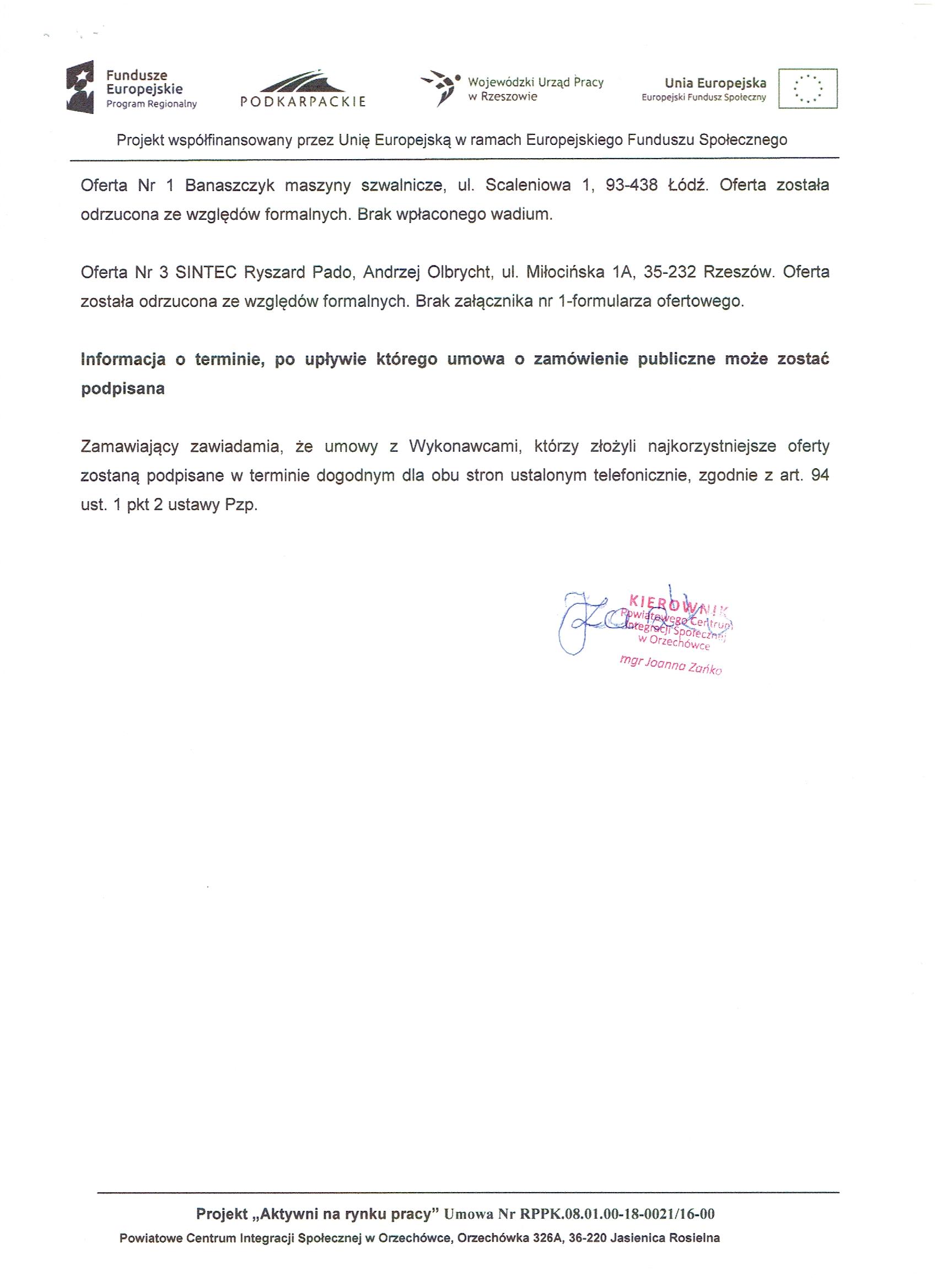 Zamawiający zawiadamia, że umowy z Wykonawcami, którzy złożyli najkorzystniejsze oferty zostaną podpisane w terminie dogodnym dla obu stron ustalonym telefonicznie, zgodnie z art. 94 ust. 1 pkt 2 ustawy Pzp.